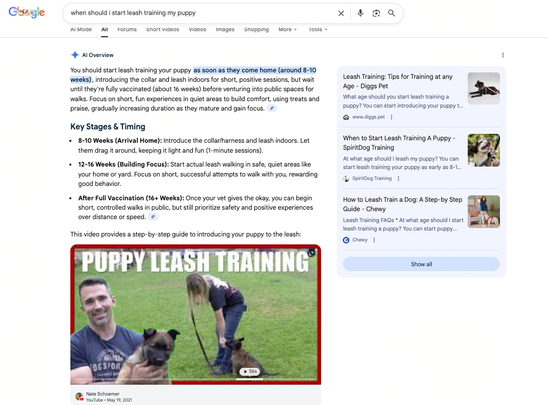 Google’s AI Overviews were designed to answer question-based searches, especially those that don’t require a map or a list of nearby providers. When someone types “best haircut for a Shih Tzu,” “how often should a puppy be bathed,” or “when to start leash training,” the search results often begin with a synthesized explanation instead of links. These summaries draw from multiple high-quality sources, which means that businesses offering grooming, boarding, training, or breeding services now have a new pathway for visibility. It doesn’t replace local search results or the maps pack, but it shapes how people discover expertise long before they reach a booking decision.